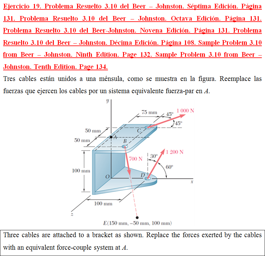 Tres cables están unidos a una ménsula, como se muestra en la figura. Reemplace las fuerzas que ejercen los cables por un sistema equivalente fuerza-par en A.