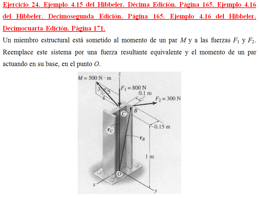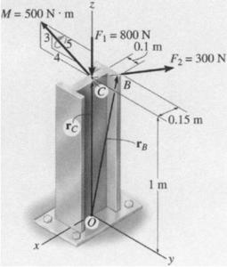 Un miembro estructural está sometido al momento de un par M y a las fuerzas F1 y F2. Reemplace este sistema por una fuerza resultante equivalente y el momento de un par actuando en su base, en el punto O.