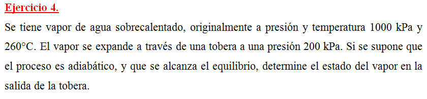 Se tiene vapor de agua sobrecalentado, originalmente a presión y temperatura 1000 kPa y 260°C. El vapor se expande a través de una tobera a una presión 200 kPa. Si se supone que el proceso es adiabático, y que se alcanza el equilibrio, determine el estado del vapor en la salida de la tobera.
