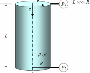 \( \displaystyle v_z = -\left(\frac{P_0 – P_L}{4\,\mu\,L} \right) r^2 + \left(\frac{P_0 – P_L}{4\,\mu\,L} \right) R^2 \)