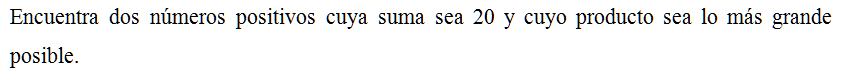 Hállense dos números positivos cuya suma sea 20, y tales que su producto sea lo mayor posible.