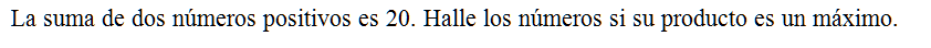 La suma de dos números positivos es 20. Halle los números si su producto es un máximo.