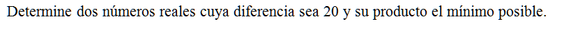 Determine dos números reales cuya diferencia sea 20 y su producto el mínimo posible.