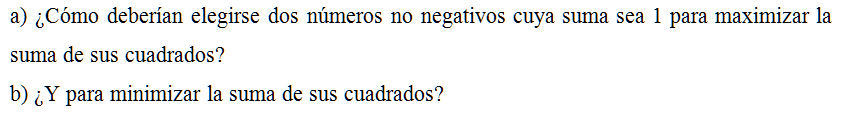 a) ¿Cómo deberían elegirse dos números no negativos cuya suma sea 1 para maximizar la suma de sus cuadrados?