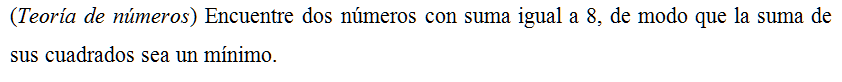 (Teoría de números) Encuentre dos números con suma igual a 8, de modo que la suma de sus cuadrados sea un mínimo.