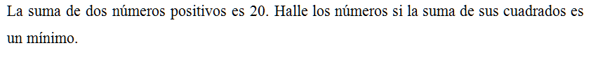 La suma de dos números positivos es 20. Halle los números si la suma de sus cuadrados es un mínimo.