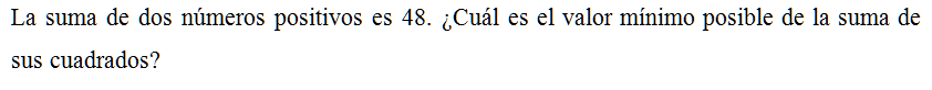 La suma de dos números positivos es 48. ¿Cuál es el valor mínimo posible de la suma de sus cuadrados?
