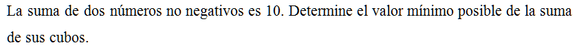 La suma de dos números no negativos es 10. Determine el valor mínimo posible de la suma de sus cubos.