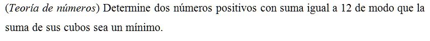 (Teoría de números) Determine dos números positivos con suma igual a 12 de modo que la suma de sus cubos sea un mínimo.