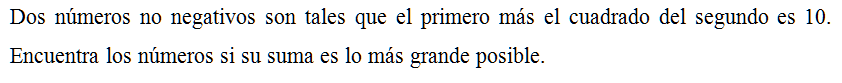 Dos números no negativos son tales que el primero más el cuadrado del segundo es 10. Encuentra los números si su suma es lo más grande posible.