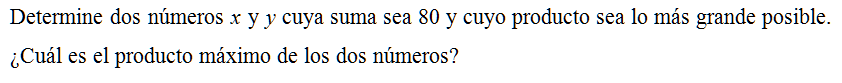 Determine dos números x y y cuya suma sea 80 y cuyo producto sea lo más grande posible. ¿Cuál es el producto máximo de los dos números?