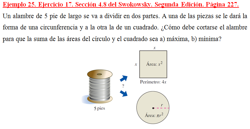 Un alambre de 5 pie de largo se va a dividir en dos partes. A una de las piezas se le dará la forma de una circunferencia y a la otra la de un cuadrado. ¿Cómo debe cortarse el alambre para que la suma de las áreas del círculo y el cuadrado sea a) máxima, b) mínima?