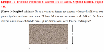 (Cerco de longitud mínima). Se va a cerrar un terrero rectangular y luego dividirlo en dos partes iguales mediante una cerca. El área del terreno encerrado es de 864 m2. Se desea utilizar la mínima cantidad de cerca. ¿Qué dimensiones debe tener el rectángulo?