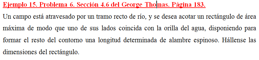 Un campo está atravesado por un tramo recto de río, y se desea acotar un rectángulo de área máxima de modo que uno de sus lados coincida con la orilla del agua, disponiendo para formar el resto del contorno una longitud determinada de alambre espinoso. Hállense las dimensiones del rectángulo.
