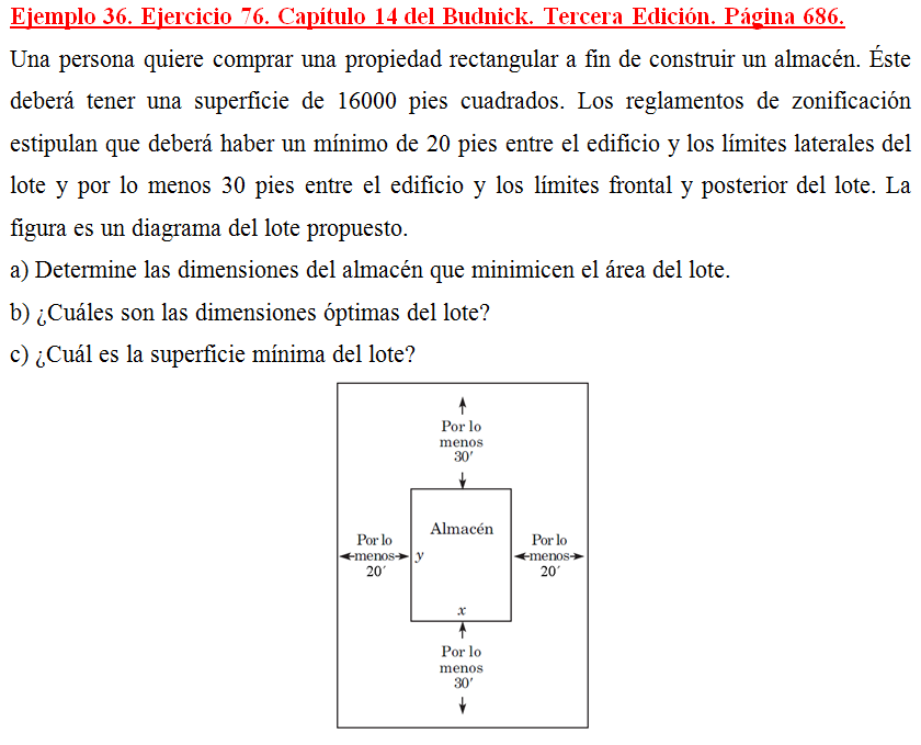Una persona quiere comprar una propiedad rectangular a fin de construir un almacén. Éste deberá tener una superficie de 16000 pies cuadrados. Los reglamentos de zonificación estipulan que deberá haber un mínimo de 20 pies entre el edificio y los límites laterales del lote y por lo menos 30 pies entre el edificio y los límites frontal y posterior del lote. La figura es un diagrama del lote propuesto.