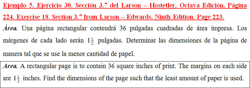 Área. Una página rectangular contendrá 36 pulgadas cuadradas de área impresa. Los márgenes de cada lado serán 1½ pulgadas. Determinar las dimensiones de la página de manera tal que se use la menor cantidad de papel.