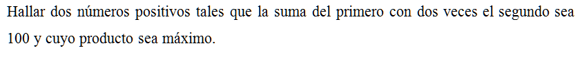 Hallar dos números positivos tales que la suma del primero con dos veces el segundo sea 100 y cuyo producto sea máximo.