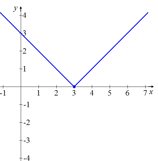 Para obtener la gráfica de la función valor absoluto correspondiente a la función f (x) = x – 3, esto es, f (x) = | x – 3 |, las partes positivas de la gráfica (azul) permanecen iguales y las negativas se reflejan sobre el eje x. El cero permanece igual en ambas. Se obtiene lo siguiente: