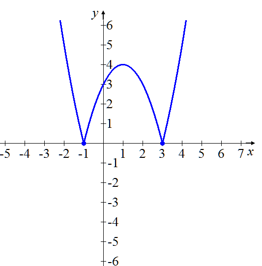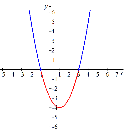 Para obtener la gráfica de la función valor absoluto correspondiente a la función f (x) = x2 – 2 x – 3, esto es, f (x) = | x2 – 2 x – 3 |, las partes positivas de la gráfica (azul) permanecen iguales y las negativas se reflejan sobre el eje x. El cero permanece igual en ambas. Se obtiene lo siguiente: