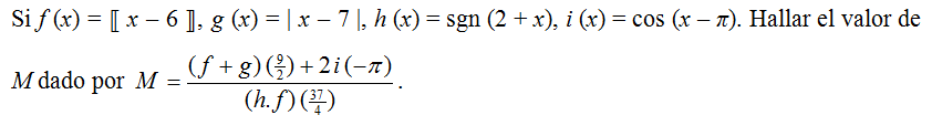 Si f (x) = ⟦ x – 6 ⟧, g (x) = | x – 7 |, h (x) = sgn (2 + x), i (x) = cos (x – π). Hallar el valor de M dado por \(\displaystyle M=\frac{(f+g)\;( \frac{9}{2})+2i\;(-\pi)}{(h.f)\;(\frac{37}{4})}\).