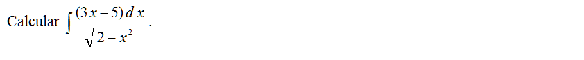 Calcular \( \displaystyle \int\frac{(3\,x-5)\,d\,x}{\sqrt{2-x^2}}\).