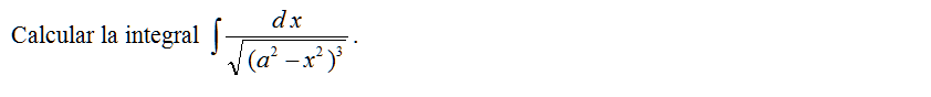 Calcular la integral \( \displaystyle \int \frac{d\,x}{\sqrt{(a^2-x^2)^3}}\).