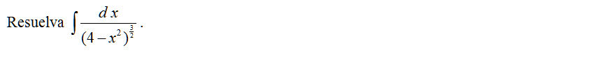 Respuesta: \( \displaystyle \int \frac{d\,x}{(4-x^2)^{\frac{3}{2}}}=\frac{x}{4\sqrt{4-x^2}}+C\)