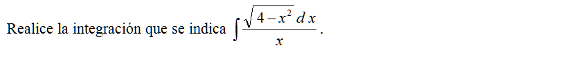 Realice la integración que se indica \( \displaystyle \int \frac{\sqrt{4-x^2}\,d\,x}{x}\).