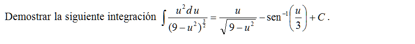 Demostrar la siguiente integración \( \displaystyle \int \frac{u^2d\,u}{(9-u^2)^{\frac{3}{2}}}=\frac{u}{\sqrt{9-u^2}}-\sin\left(\frac{u}{3}\right)+C\).