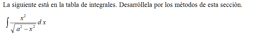 La siguiente está en la tabla de integrales. Desarróllela por los métodos de esta sección. \( \displaystyle \int \frac{x^2}{\sqrt{a^2-x^2}}d\,x\).