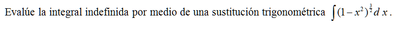 Evalúe la integral indefinida por medio de una sustitución trigonométrica \( \displaystyle \int (1-x^2)^{\frac{3}{2}}d\,x\).
