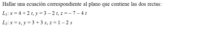Hallar una ecuación correspondiente al plano que contiene las dos rectas: