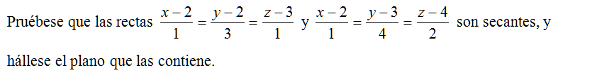 Pruébese que las rectas \( \displaystyle \frac{x-2}{1}=\frac{y-2}{3}=\frac{z-3}{1}\) y \( \displaystyle \frac{x-2}{1}=\frac{y-3}{4}=\frac{z-4}{2}\) son secantes, y hállese el plano que las contiene.
