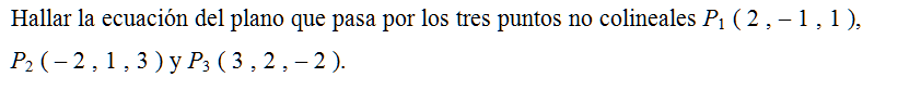 Hallar la ecuación del plano que pasa por los tres puntos no colineales P1 ( 2 , – 1 , 1 ), P2 ( – 2 , 1 , 3 ) y P3 ( 3 , 2 , – 2 ).