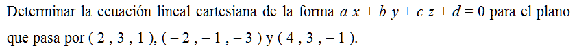 Determinar la ecuación lineal cartesiana de la forma a x + b y + c z + d = 0 para el plano que pasa por ( 2 , 3 , 1 ), ( – 2 , – 1 , – 3 ) y ( 4 , 3 , – 1 ).