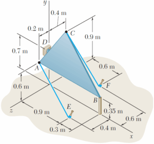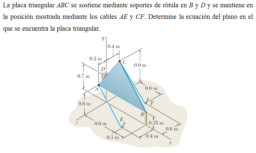 La placa triangular ABC se sostiene mediante soportes de rótula en B y D y se mantiene en la posición mostrada mediante los cables AE y CF. Determine la ecuación del plano en el que se encuentra la placa triangular.