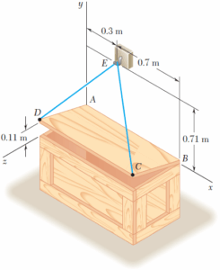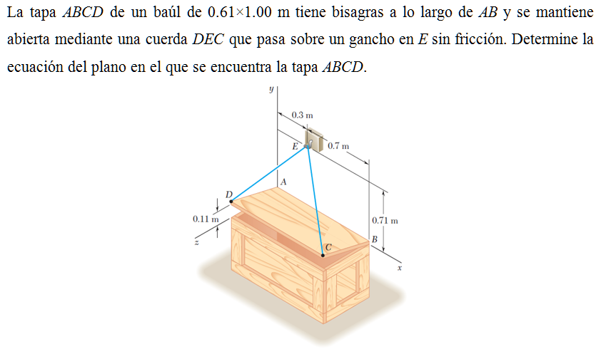 La tapa ABCD de un baúl de 0.61×1.00 m tiene bisagras a lo largo de AB y se mantiene abierta mediante una cuerda DEC que pasa sobre un gancho en E sin fricción. Determine la ecuación del plano en el que se encuentra la tapa ABCD.