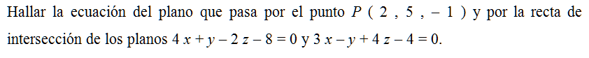 Hallar la ecuación del plano que pasa por el punto P ( 2 , 5 , – 1 ) y por la recta de intersección de los planos 4 x + y – 2 z – 8 = 0 y 3 xy + 4 z – 4 = 0.