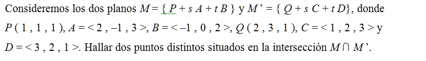 Consideremos los dos planos M = { P + s A + t B } y M ’ = { Q + s C + t D}, donde P ( 1 , 1 , 1 ), A = < 2 , – 1 , 3 >, B = < – 1 , 0 , 2 >, Q ( 2 , 3 , 1 ), C = < 1 , 2 , 3 > y D = < 3 , 2 , 1 >. Hallar dos puntos distintos situados en la intersección M ∩ M ’.