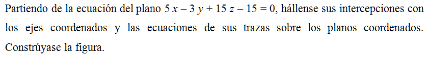 Partiendo de la ecuación del plano 5 x – 3 y + 15 z – 15 = 0, hállense sus intercepciones con los ejes coordenados y las ecuaciones de sus trazas sobre los planos coordenados. Constrúyase la figura.