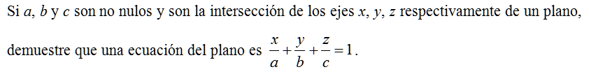 Si a, b y c son no nulos y son la intersección de los ejes x, y, z respectivamente de un plano, demuestre que una ecuación del plano es \( \displaystyle \frac{x}{a}+\frac{y}{b}+\frac{z}{c}=1\).