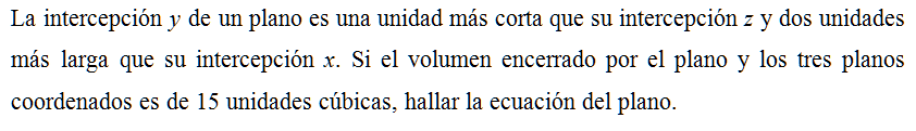 La intercepción y de un plano es una unidad más corta que su intercepción z y dos unidades más larga que su intercepción x. Si el volumen encerrado por el plano y los tres planos coordenados es de 15 unidades cúbicas, hallar la ecuación del plano.