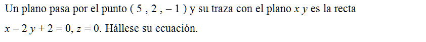 Un plano pasa por el punto ( 5 , 2 , – 1 ) y su traza con el plano x y es la recta x – 2 y + 2 = 0, z = 0. Hállese su ecuación.