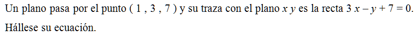 Un plano pasa por el punto ( 1 , 3 , 7 ) y su traza con el plano x y es la recta 3 x – y + 7 = 0. Hállese su ecuación.