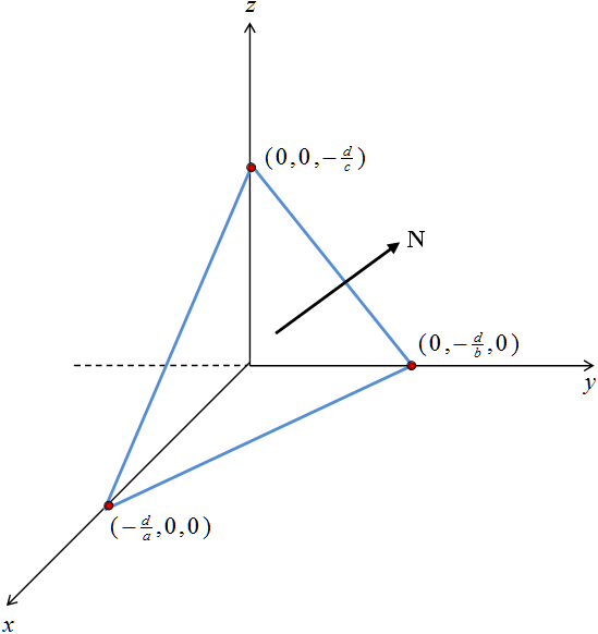 – Intersección con el eje z: Sustituir x = 0 y y = 0 en la ecuación del plano y resolver en z la ecuación de primer grado resultante. El punto obtenido es \( \displaystyle \left(0,0,-\frac{d}{c}\right)\).
