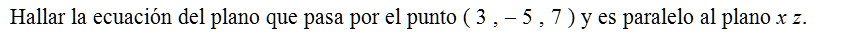 Hallar la ecuación del plano que pasa por el punto ( 3 , – 5 , 7 ) y es paralelo al plano x z.