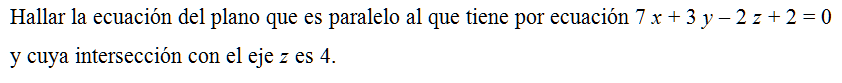 Hallar la ecuación del plano que es paralelo al que tiene por ecuación 7 x + 3 y – 2 z + 2 = 0 y cuya intersección con el eje z es 4.