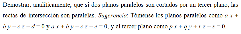 Demostrar, analíticamente, que si dos planos paralelos son cortados por un tercer plano, las rectas de intersección son paralelas. Sugerencia: Tómense los planos paralelos como a x + b y + c z + d = 0 y a x + b y + c z + e = 0, y el tercer plano como p x + q y + r z + s = 0.