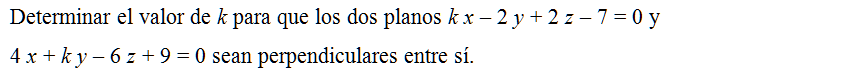 Determinar el valor de k para que los dos planos k x – 2 y + 2 z – 7 = 0 y 4 x + k y – 6 z + 9 = 0 sean perpendiculares entre sí.