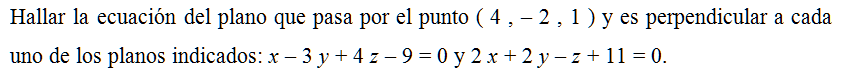 Hallar la ecuación del plano que pasa por el punto ( 4 , – 2 , 1 ) y es perpendicular a cada uno de los planos indicados: x – 3 y + 4 z – 9 = 0 y 2 x + 2 y – z + 11 = 0.